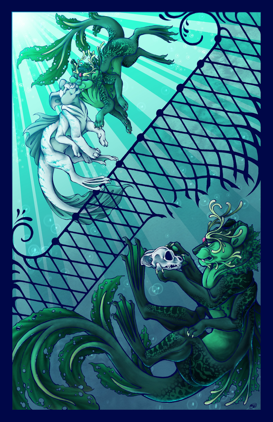 This story is about two waterweasel's... I haven't officially named them, but to make this easier the white one is called Amorette and the dark green one is called Cessair. Amorette travels around the Gulf of Mexico, and Cessair is the guardian of Florida's Gulf Coast Flatwoods (a very large swamp land). By chance these two meet on the boundary separating their respective territories, and over time forge a friendship that blossoms into love. As they begin to court one another Amorette asks Cessair to take her on a tour of his kingdom. However Cessair is reluctant since Amorette's markings aren't well suited to camouflage in the marsh lands, but he is eventually is convinced. Their trip together seems to be going very well until a storm starts to brew forcing them to go further inland. As they travel though the swamp Amorette is spotted by some fishermen... Amorette and Cessair get insnared in a net and both start to panic! Cessair is able to brake free, but Amorette is hauled into the fishermen's boat where they ride straight back towards the storm. Cessair tries to stop them but fails losing track of them in the hurricane that fallows. Months pass and Cessair is still desperately trying to find any trace of of his beloved, only to be devastated when he discovers the scraps of fishermen's boat and Amorette's bones underneath. From that day on Cessair becomes a recluse, and unable to put his soulmate to rest carries around her remains.
