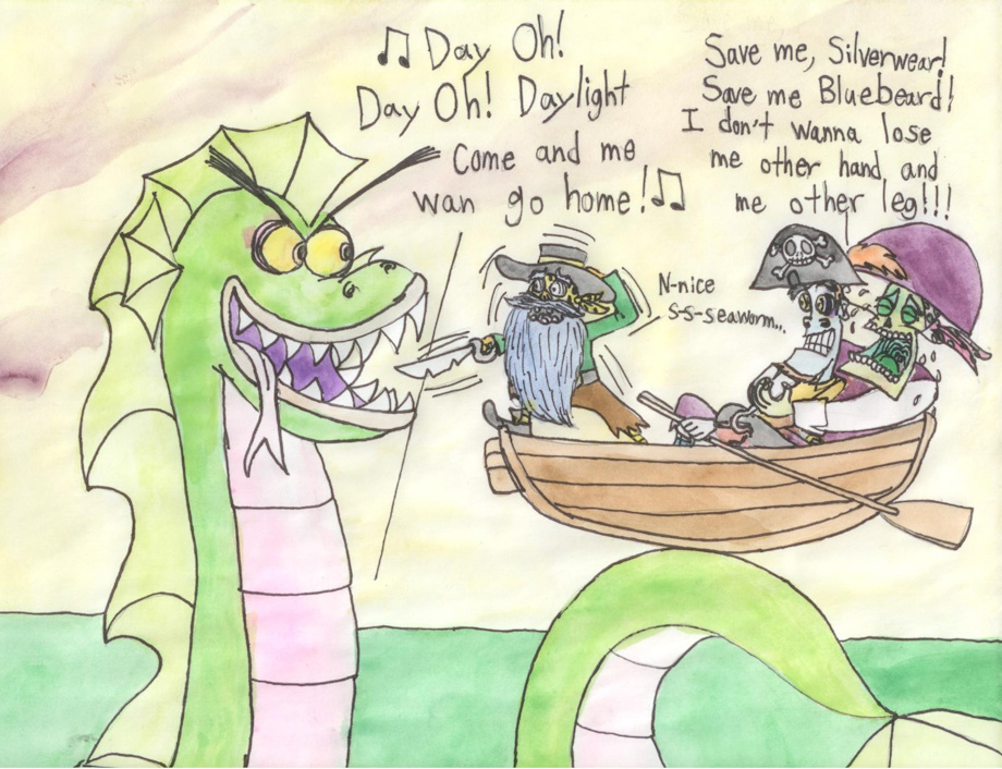 I thought that if the seaworm is going to be a parody of the croc from Peter Pan, then he should have something in his stomach other than the ticking clock. So I thought why not a record player that never stops playing a Harry Belafonte songs. This works because this song along with others like "Jump in the Line" are heard in the movie.