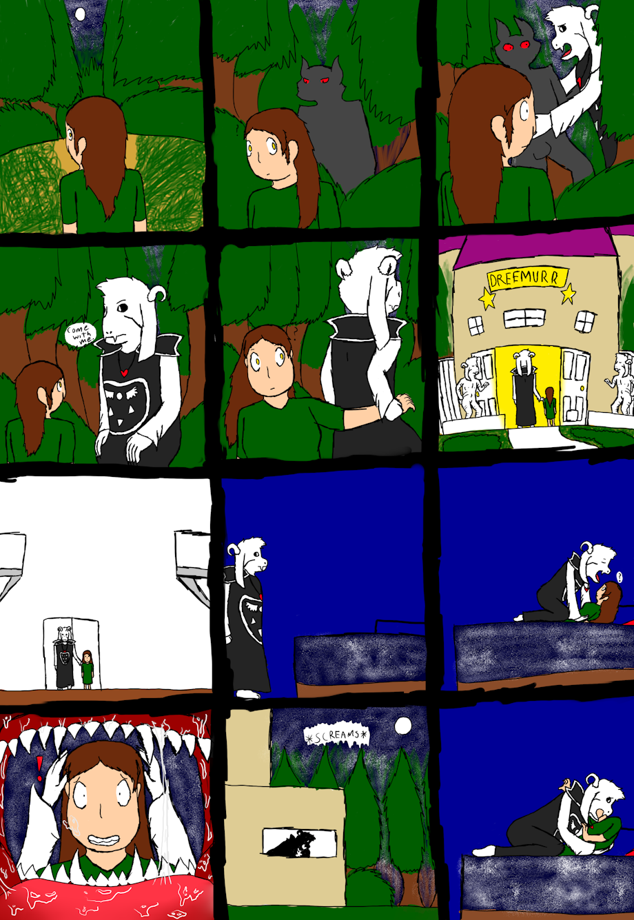 An Asriel Vore Comic. This is page 1, and there will be more pages than that, but this took me a really long time, and the other pages will probably take just as long. Oh, and that red eyed shadow is a werewolf. Yes, that is a mansion. Asriel is extremely rich, and he didn't only get all that money from his job, people kept giving him money non stop, American money, yen, euro, all kinds of money. Don't worry, Holli won't die, Asriel will never hurt her :)