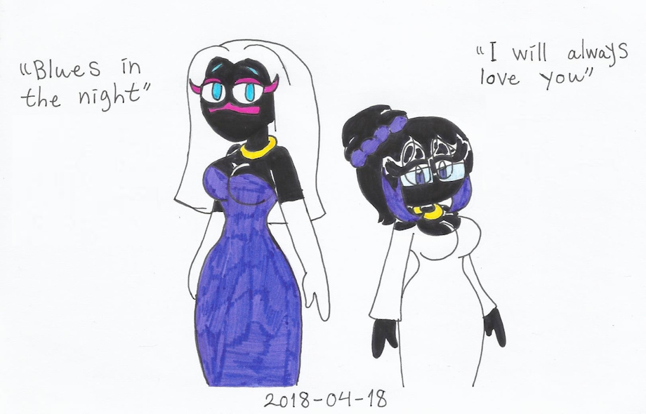 Here's Martian Queen in a dress when she sang "Blues in the night" in one of Duck Dodgers episodes. And Next to her with Juniper Ebonywood wearing a Whitney Houston styled dress when she sang "I will always love you".