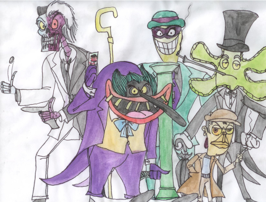 My bud, :iconlucifertheshort:, requested this picture. He suggested Mr. Big (bottom left) to play Joe Chill, the man who murdered Bruce Wayne's parents, and Germs Ponscum to play the Penguin (upper left), Or in this case, I call him the "Pengerm." The other two are Jesse Germs as Two-Face and the Evil Salesman from "Bad Neighbor Beetlejuice" as the Riddler. And this gallery wouldn't be complete without Scuzzo The Clown as the infamous "Scuzzer."