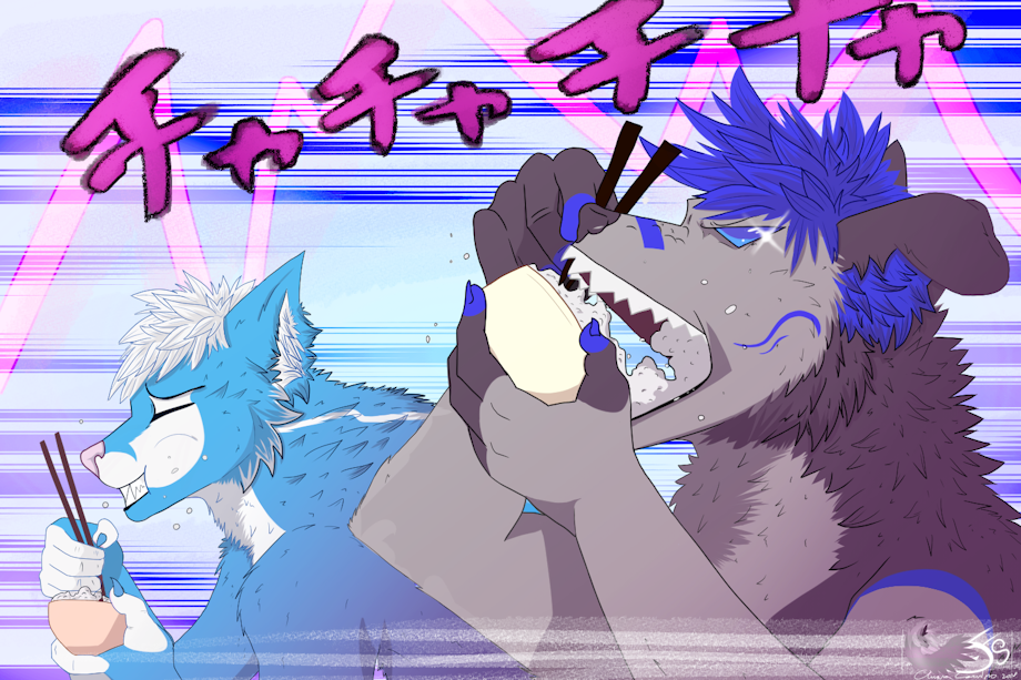 This...just this. It's too awesome and fun. World tournament eating against the husband, Cyano. Who will will. Ashi, the big wolf, or Cyano the slender cyan fox? What a fantastic idea for a YCH this was and Fleira did a wonderful job! Thanks!