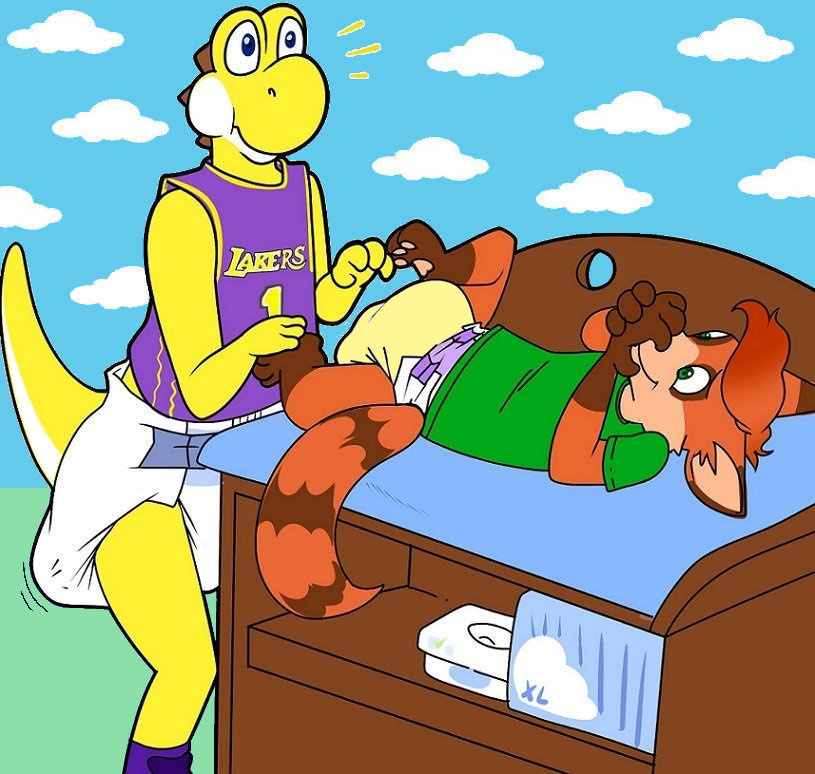 Showtime changing Dayton, who's in a rather soaked and filled diaper. Seems the yosh started filling his own diaper right before changing the coon, causing the little fella to giggle quite a bit.