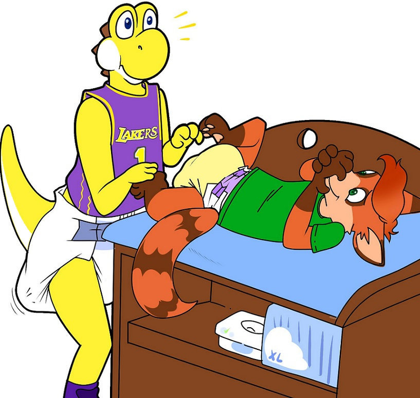 Showtime changing Dayton, who's in a rather soaked and filled diaper. Seems the yosh started filling his own diaper right before changing the coon, causing the little fella to giggle quite a bit.