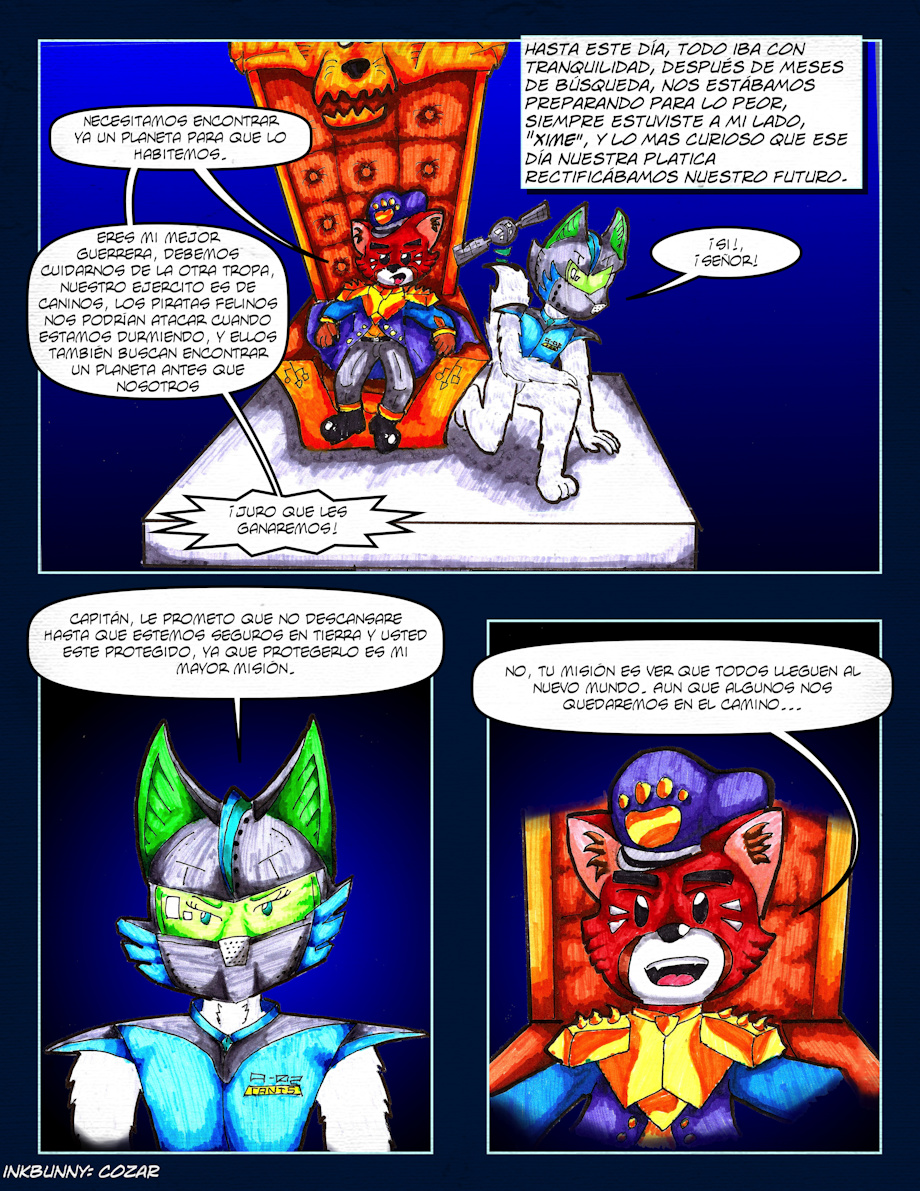 la historia es UNA ODISEA ESPACIAL, CONTADA POR UN PANDA ROJO LLAMADO AILURUS, quien junto a su protectora de la alta elite militar canina una zorra blanca llamada xime deben librar feroces batallas con los felinos quienes les han traicionado; para llegar a su destino incierto en el vago espacio, esta épica travesía, esta llena de acción, incertidumbre, drama y un toque de romance. una exquisitez hecha a mano y ensamblada en digital!