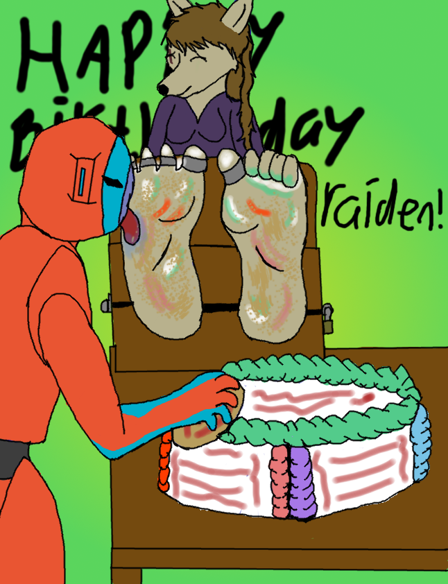 birthday picture for a great bro @RaidenDeoxysX. been a while since cassandra had some fun with raiden, so she baked cake for him and had a very unique table prepared. of course raiden knew what is going on and here's the answer of the table, raiden taking cake with hand and smothering the pieces on her soles and then licking them off. ticklish feeling for cassandra as she is pretty sensitive on her feet/paws. happy birthday raiden. ^^