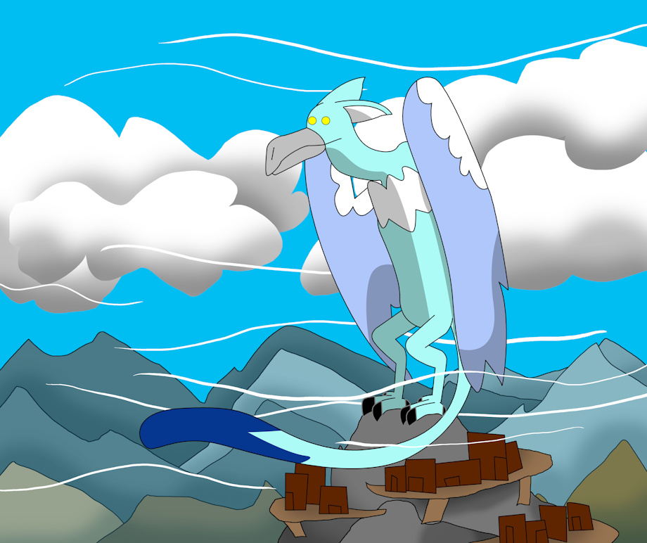 The cloud breather is a creature only spoken of in stories, there are no real ones to speak of. It is said that is born of the wind and storms that rage high above the lands of Dracar. The cloud breather is a massive flying creature that perchs a top mountains and cast shadows to the valleys below. When it takes off, it creates winds so strong that they can blow all the clouds out of the sky. In the mighty wings of a thunderbird, Roc or even elder dragon aren't strong enough to fight against the cloud breather's gusts.