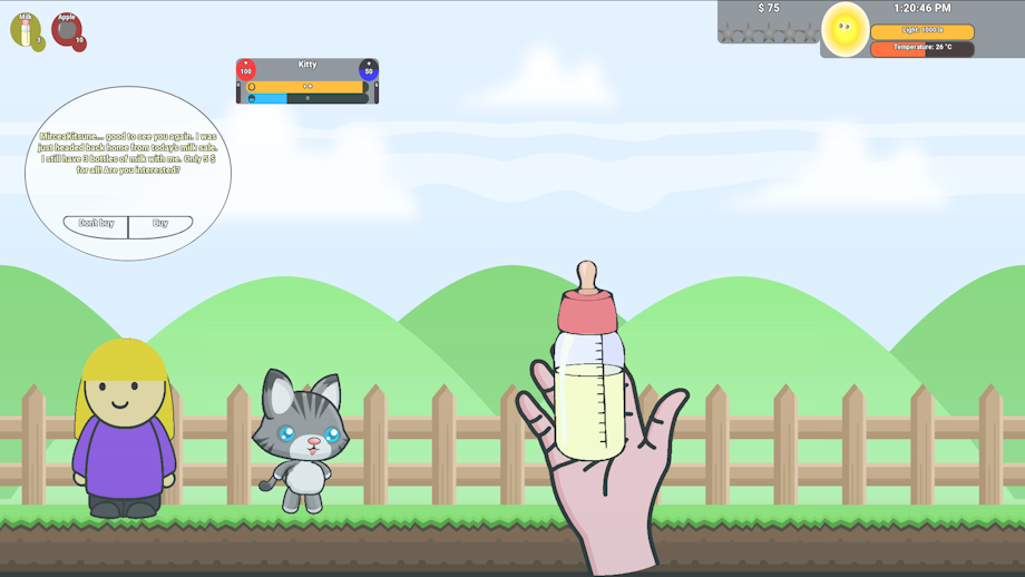 - Milk was implemented as a second food type. A new sales person has been added with it, which will also appear randomly and sell you milk when you're in need. Milk costs roughly half as much as apples, but is also only half as filling for your pet. Milk is also the food you start the game with, apples now being the first unlockable food which only becomes available after your pet has aged a little.