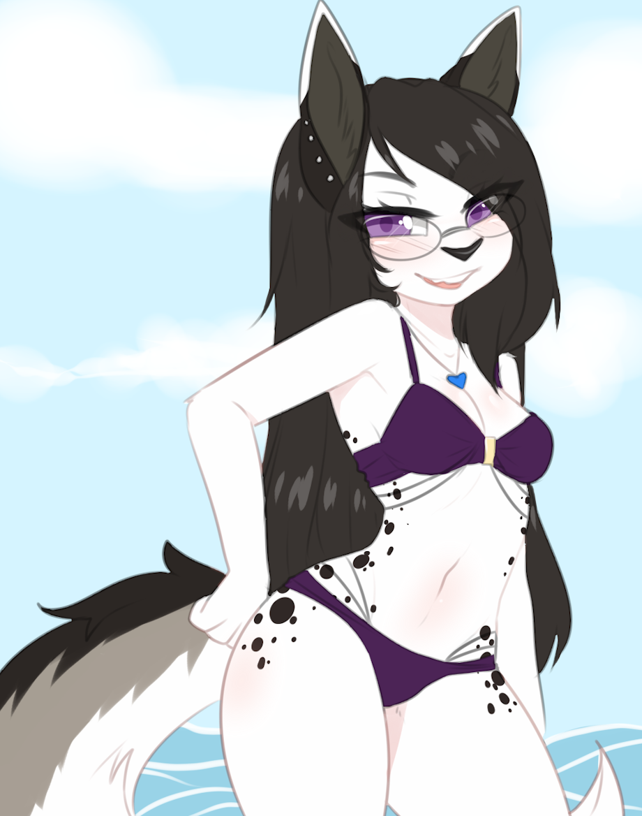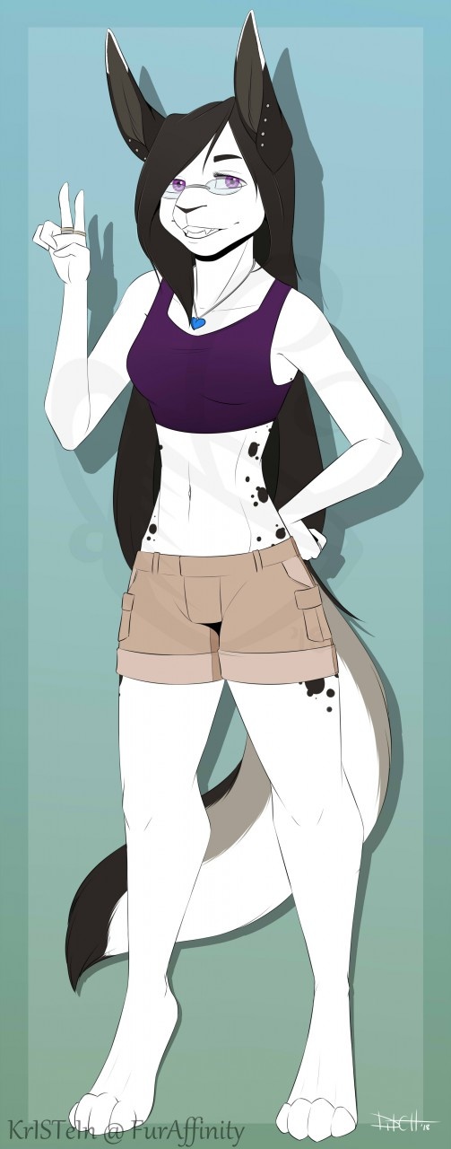 Kacey is a tall, slender bunny/fox hybrid with the fur colors of her English Spot rabbit ancestors mingled with a few touches from her swift fox kin. She has pure white fur speckled with black spots, purple eyes, long back hair and a sly, toothy smile.