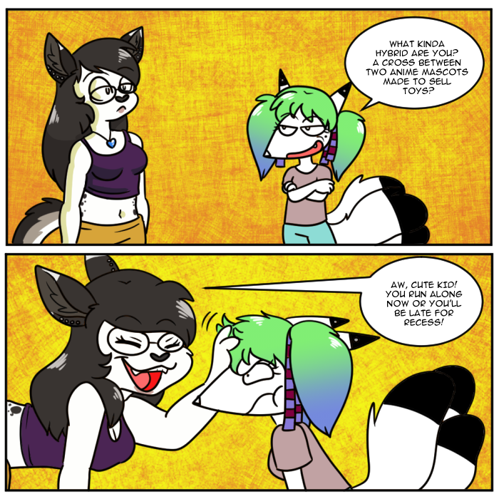Kacey is a friendly, intelligent girl with her mother's intense curiosity and her father's easy charm. Being a hybrid of a predator species and a prey species she sometimes suffers from mixed signals which can make her seem hesitant and uncertain. For the most part, however, she is open and sociable and it would seem her vulpine instincts are slightly dominant, making her fearless in most situations.
