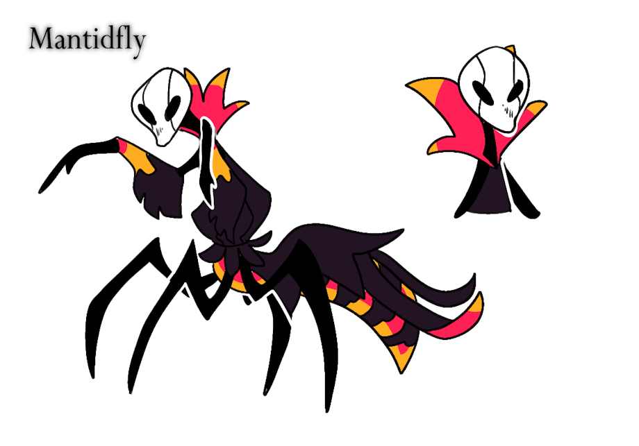 Made another hollow knight fan character! They are Mantidfly, a bug that came to Hollownest with the Grimm Troupe before deciding to stick around. They are a smug hotshot, and begin hunting the mindless bugs in Hollownest with a superiority complex. They enjoy the thrill of the hunt, amused by toying with their prey, not respectful of anything that falls to them.