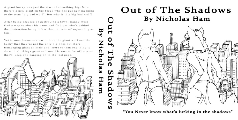 So here's what my new story book will look like in regards to a cover! I mainly used the ref sheets for Danny and Shadow here but in a line format with some detailed buildings in front of them for the front here. The back is just what you can see is a mix of destroyed buildings. I have to admit from an illustrators point of view this has got to be the most hardest thing I've done to date. Doing city skylines is something easy but doing destroyed buildings was a challenge indeed. This book is surely a lot more different than my first book on two fronts. Unlike my first book that consisted of three short stories with all three main macro chars of mine this one is just one long story with Danny my husky and Shadow my wolf being the main characters and my fellow macro friendsKenta_Nakamura and Jarvis_Greatwolf being featured halfway in the book. The other thing which is a big difference of course is the content rating for this book. My first book was a general rated book whereas this is more of an adult themed book. There is the stuff you'd expect in a macro story in this in regards to rampaging, size differences and a lot of naughty stuff too.