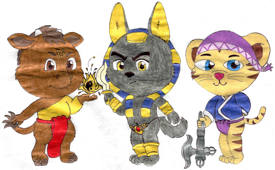 Here we have a drawing involving not just my two Tibetan cub characters, but also the character from the upcoming indie game Anubis and the Buried Bone. He is usually depicted taller like in this art by one of the creators https://inkbunny.net/s/1535398 so I aged him down to my characters age which is about 4-5 years old.