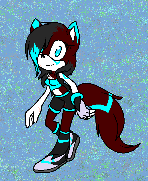 maroon fur, black hair, turquoise eyes, white skin, turquoise branding, scars on her hand, neck, and face