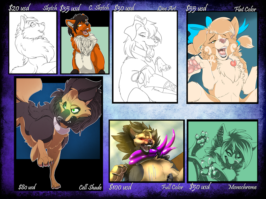 Sketch: $20 usd Basic quick sketch of your character doing whatever. Plus $20 per extra char. -- Color Sketch: $35 usd Basic coloring over a sketch with lazy shading. Plus $25 per extra char. --- Lines: $30 usd Smooth, crispy line art of your character. Plus $20 per extra char. -- Flat Color: $55 usd Flat colored image. Minimal detailing. Plus $30 per extra char. -- Cell Shaded: $80 usd Flat colored image with hard shading. Medium detailing. Plus $50 per extra char. -- Soft Shaded: $100 usd Full colored image with smooth shading. Highest detailing. Extras are $70 each. -- Monochrome: $50 usd -New- Line Art with hard shading. Medium detailing. Plus $30 usd per extra char -- Sketch Page: $100 (not shown) A page of sketches featuring 5-7 images of artistic freedom. Examples: http://www.furaffinity.net/view/17914200/ (nsfw) http://www.furaffinity.net/view/14249211/ (nsfw) http://www.furaffinity.net/view/14890493/ (nsfw)