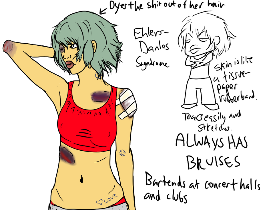 Mary is an Irish/Puerto Rican bartender with Ehlers-Danlos syndrome. She has brown eyes naturally, but likes to wear white contacts. She has dirty blonde hair naturally, but dyes it into oblivion all the time.