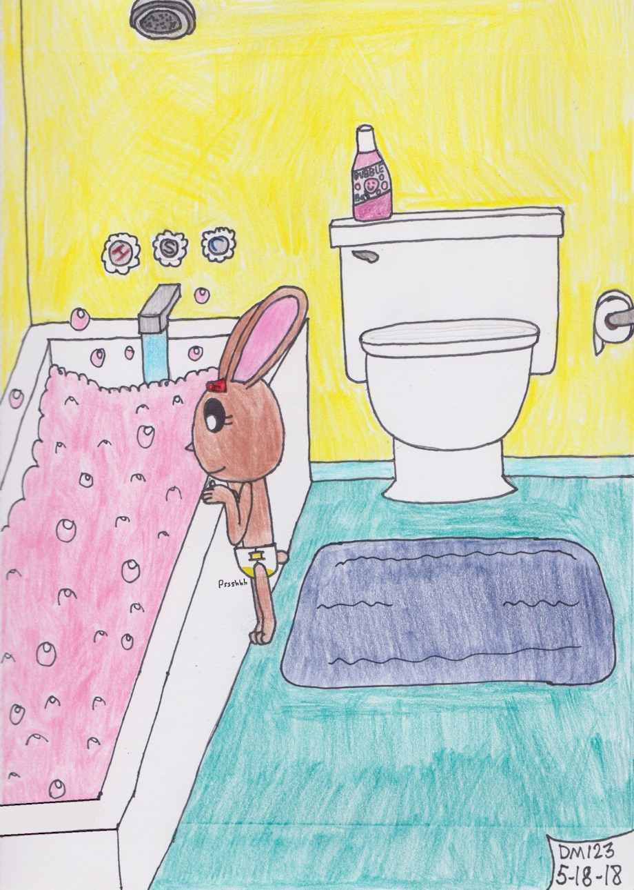Amy watching the bathtub fill up with bubbles as she waits for her bubble bath to fill up with water while peeing her diaper.