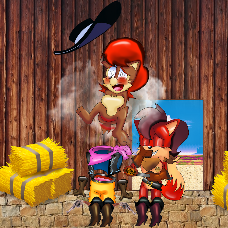 * Fiona have came up behind up and branded her behind...causing the big bad outlaw to shoot up into the air... and out of her clothes *