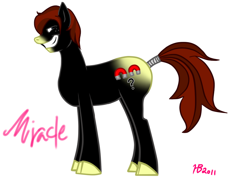 Miracle is a dingus and a doof. Her cutie mark is two magnets and a question mark. If she represented an element, it would be the element of curiosity, I suppose.