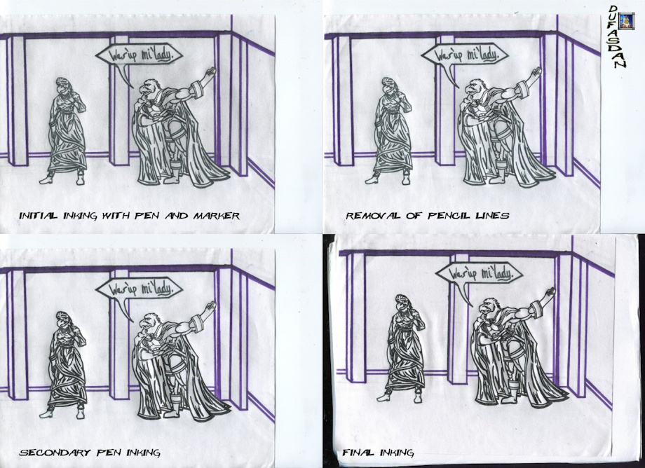 As it states, the inking progress of Was'up Mi'lady https://www.furaffinity.net/view/3081836/ that I am working on along with other self projects. I do not perform stages in inking that often since I use ballpoint pens. This was an exception due to the heavy inking style I am trying out. I figured it would be best to scan each phase so I wouldn't screw up later. It is bold of myself to do heavy inking since it is new grounds for me and I tend to have low patience in inking. LOL. ^\/^.