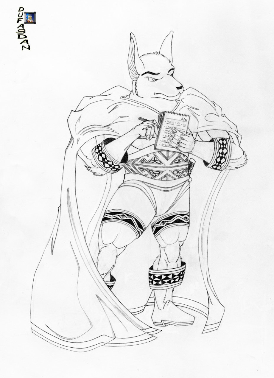 The finished lineart to the second figure of https://www.furaffinity.net/view/3458475 and ready to become shaded. I hope to do so tomorrow along with the drawing of D. Dan. I personally like how I melded Celtic knot artwork with Egyptian styles and symbolism into Jacques el Noble's costume and armor. The contrast and boldness make it jump as well. LOL. ^\/^.