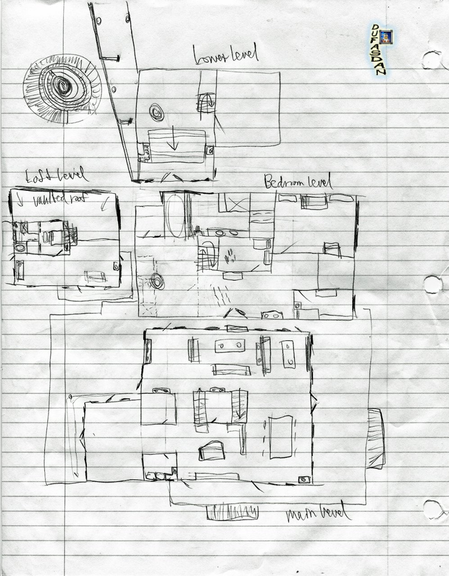 This is a house plan that I quickly sketched after I had a vivid dream on night of being inside it. All the rooms and general locations of the furniture are based on what I saw and experienced in my dream. ^\/^.