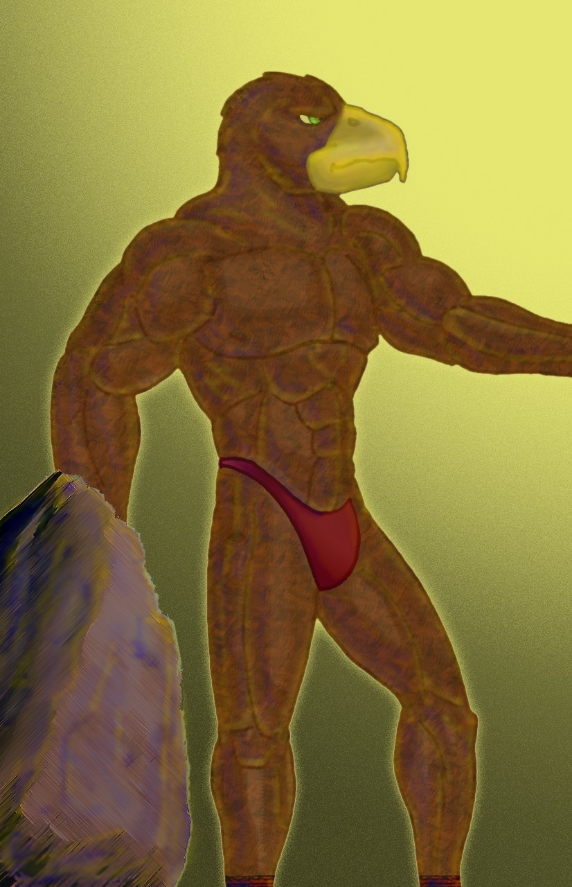 A golden eagle bodybuilder. I put the rock there because he has no hands or feet to that matter. He has socks on because when doing his feathers I somehow manage to not color that smidgen of area and so thought whether to crop it or add the upper part of the yellow feet or have socks. I went the quick way because I did not feel like researching eagle feet at the moment. Of course I could back track but that would take forever and half a day. This is my first art work made with the help of my new Adobe Photoshop Elements 6 that I got for the cheap at the university. The universities may over charge people a lot but at least they have special discounts for students.