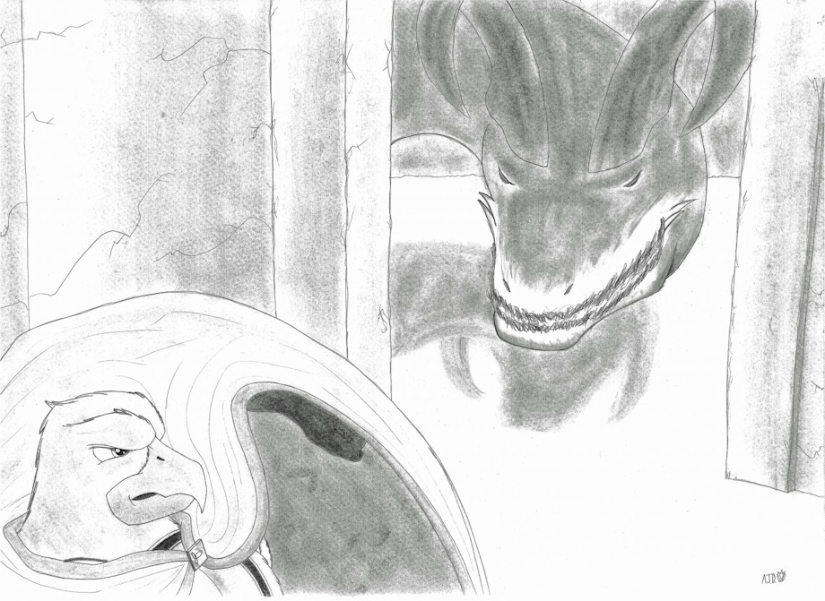 This is a picture that I have been working on for a while along with two others for my art class at Augusta State University. This, along with the others and colored versions, has been taking quite some time to accomplish. The paper this has been drawn on is 3 feet by 2 feet in size. The scanning took some time, seeing as though it scans standard sized paper. LOL. ^\/^.