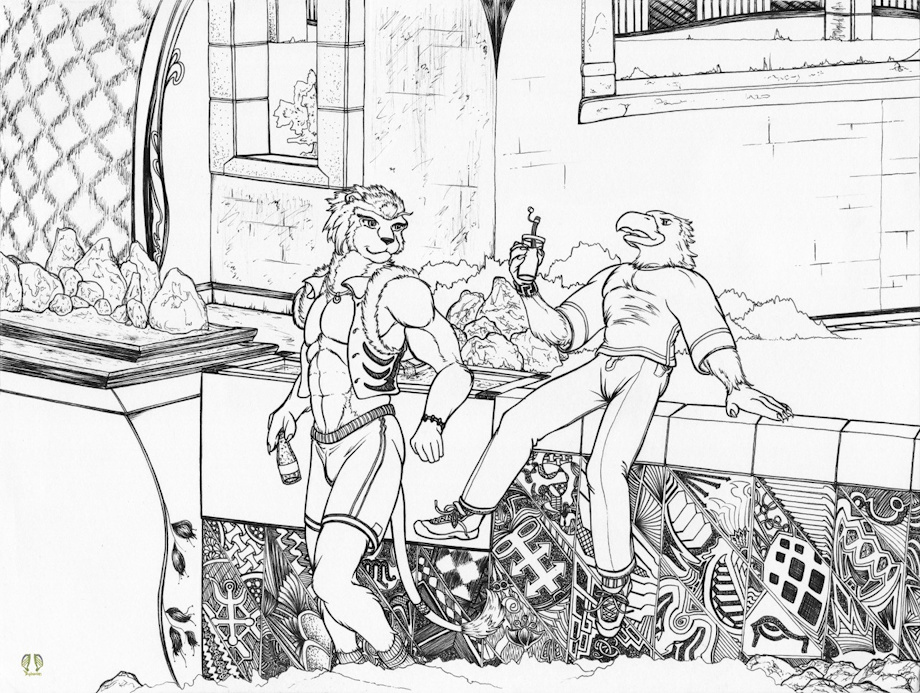 This is the inking to the pencil line art that can be found here ( https://www.furaffinity.net/view/17881137/ ). The picture shows my fursona Domineus Dan acting as a body guard to his young niece Anastasia Dan and her pet griffon Gizmo. Domineus is a very protective uncle and loves his family a lot. Those, whom he does not know and comes too close while acting as a guardian, get a dire and stern stair, as well as, a warning by way of his hand giving a hair trigger on his sword. Their tends to be a gap in a crowd. lulz. ^\/^.