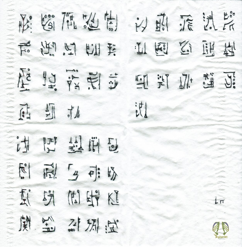 Here I have done some scribbles and doodles of the Formal Adlerian script. It was done on a piece of tissue paper in hopes that, when scanned, it would give it the character of being written on some form of parchment or rice paper even. I folded it so that I get four squares, the creases can be seen between each block of text. Each block was then filled with the fake text with the occasional omission of characters on two of the blocks to give an added sense of realism since paragraphs normally don't fill and form an even block of text. The last square I left largely blank, with a quick mark so as to seem like a signature of the author. Since this is done in only the Formal Adlerian script with a signature at the end, it gives the sense that this is a letter written by a member of the aristocracy. This was purely intended since the beginning. ^\/^.