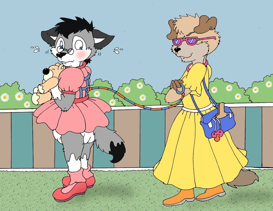 It's based on something Mommy has threatened to do irl in Canada (I have a toddler harness, and I have dresses, even if not pink ones) during my trip (which starts soon, since it's go on June 6th).