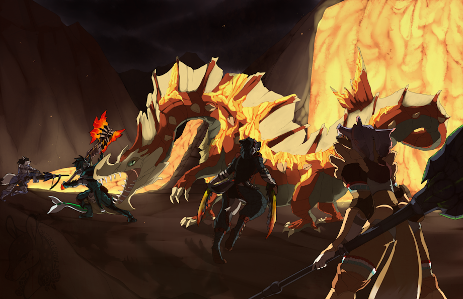 Sweeping down the volcano side the group corners an unsuspecting Anakator, as it rears up we attack.