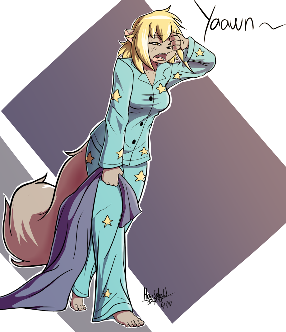 Drew my character Sonia Cal getting up for the day ahead and yes these are her actual pajamas :0 Been meaning to draw this for a while now.