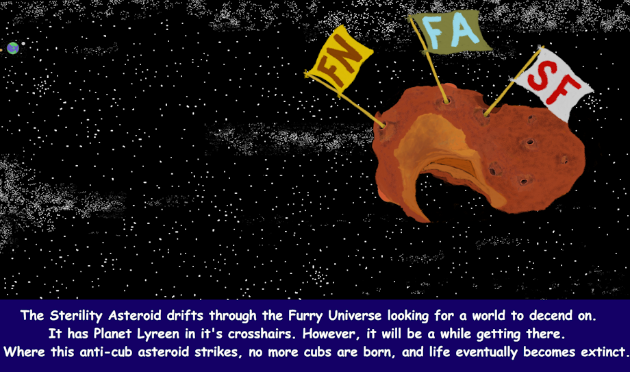The Sterility Asteroid searches out worlds in the Furry Universe to strike down on as a meteor...There are other such asteroids lurking around out there in the cosmos, being that a meteor can fall only once, and on only one planet. This kind of meteor produces a phenomenon as to where cubs are no longer born. And other life forms also do not propagate their species. Females can not get pregnant. And fruit that always had seeds or pits in them no longer have seeds or pits. No plants can produce seed. Within a couple of hundred years after such an asteroid falls onto a planet, all life there becomes extinct as there are no more generations to carry on the species.