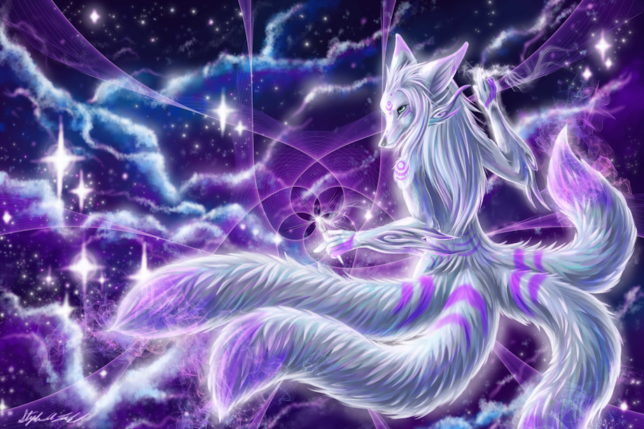 Painting of my fursona. Hand cramped up a few times on the tails, but it was worth it. X_x