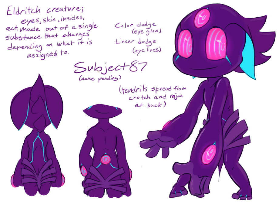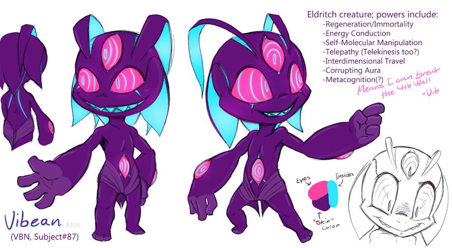 Vib's body can shift shape and density, and has a pallet of colors he can simulate. Usually pink eyes, blue/teal for insides, purple hues for outer skin, white/light pastels for hair, and black for bones and other hard parts.