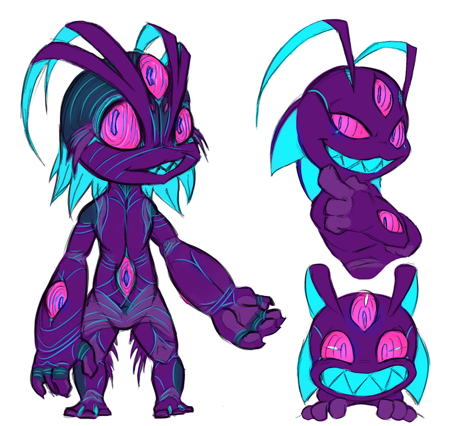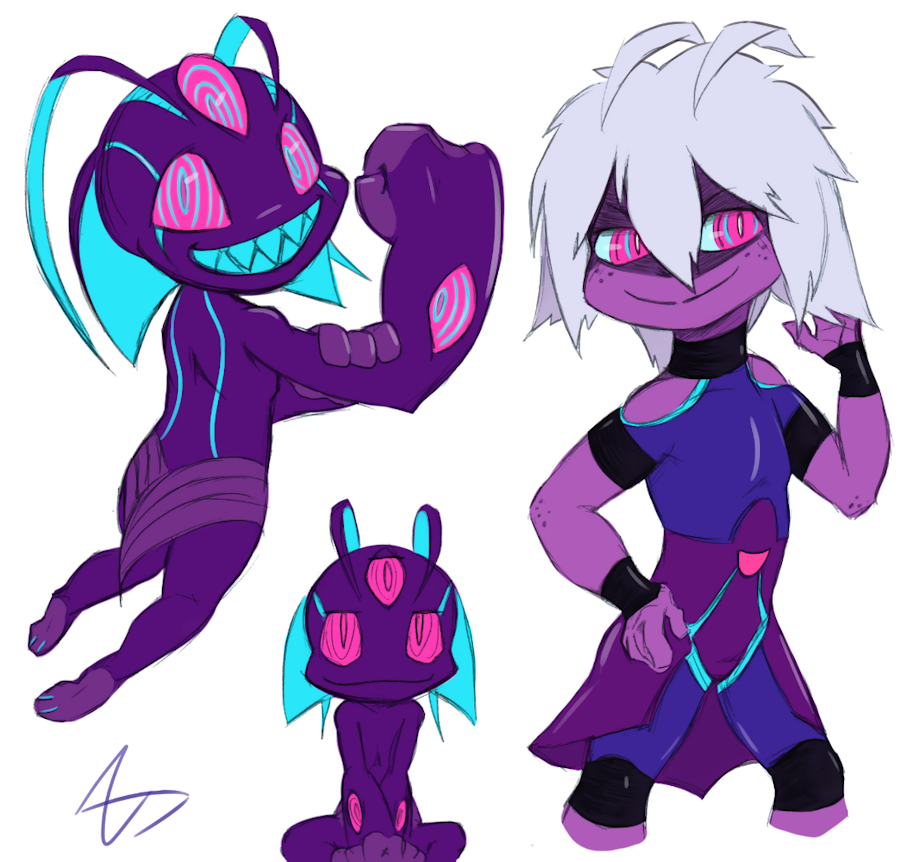 Vib's body can shift shape and density, and has a pallet of colors he can simulate. Usually pink eyes, blue/teal for insides, purple hues for outer skin, white/light pastels for hair, and black for bones and other hard parts.