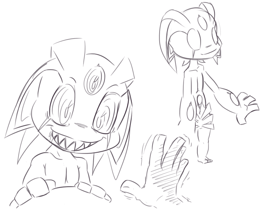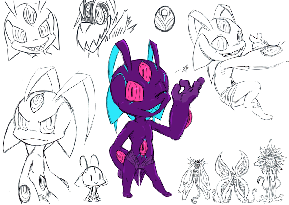 Vib's body can shift shape and density, and has a pallet of colors he can simulate. Usually pink eyes, blue/teal for insides, purple hues for outer skin, white/light pastels for hair, and black for bones and other hard parts.