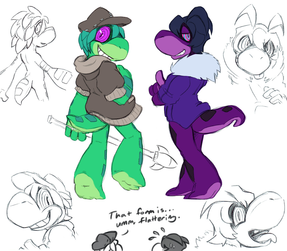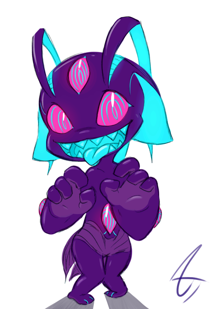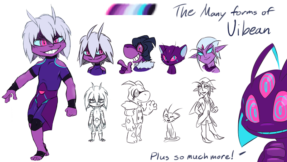 Vib's body can shift shape and density, and has a pallet of colors he can simulate. Usually pink eyes, blue/teal for insides, purple hues for outer skin, white/light pastels for hair, and black for bones and other hard parts.