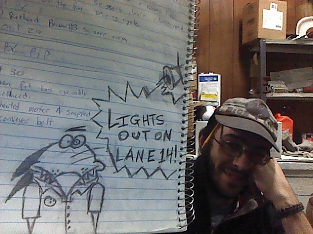 I really should get a scanner or a nice camera, seeing as how I've started drawing again. Anyways, I got bored at work today and drew this little doodle of Daggett enjoying my job, the fine art of a being a bowling alley mechanic. I imagine he'd do just fine at it. Until he broke everything. XD