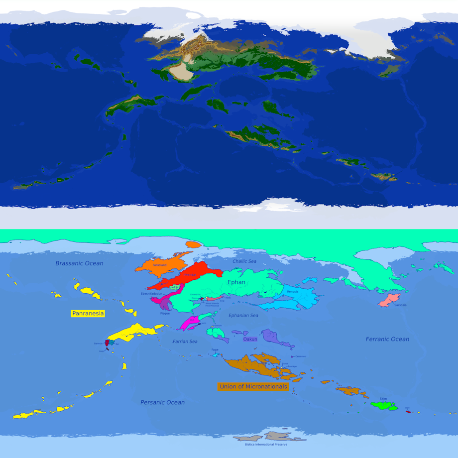 An even more detailed map of Wood Islands, showing geographical features (top), and political boundaries (bottom).