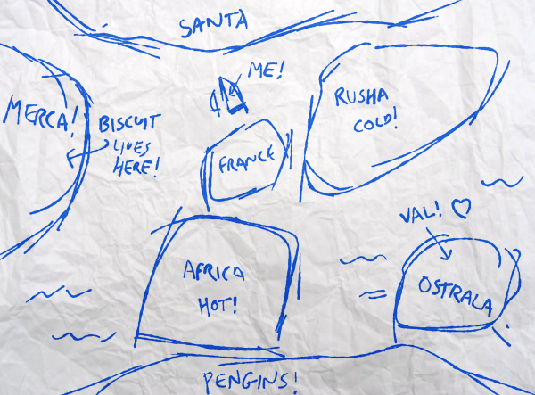 Muscuit likes making maps just as much as grown-up Musuko does. He's very good at it too. Behold, a totally accurate world map, featuring all the important details.