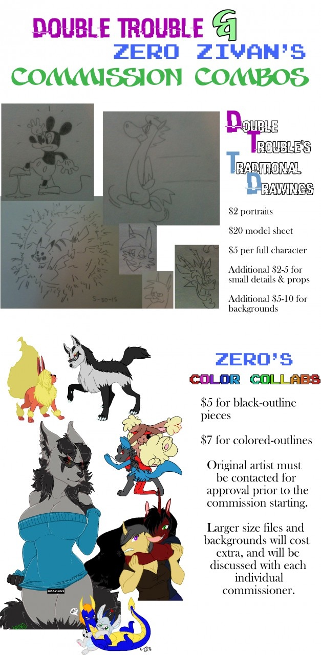 Hello, this is Double Trouble, the co-artist with Zero. Today, I will be opening commissions for anyone who's interested. Just to help you know what to expect, I'm going to tell you a little about myself. I am aspiring to become an animator someday, maybe for Disney. With practice, I can learn just about any style; from stylistic and cartoony to semi-realism. My preferred styles are inspired by 1930s/40s Disney, MGM and Warner Bros., Hannah-Barbera, modern Disney, Pixar, and 1950s-90s manga/anime. I enjoy drawing animals and people, and designing clothes. I can only take on so many commissions at once, so we will let you know if I've decided to take on your request. There is only one rule: keep it family friendly (no adult content). I will do my best to create satisfactory work that will be to each customer's liking.