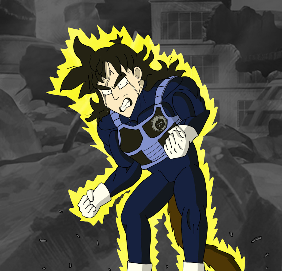 A drawing based on the last Ask Waffle question thing I did recently. I was actually going to post this drawing first but decided maybe it would be best to tell the story the other way first and post this next. For those who don't know this is supposed to represent the first time Waffle went Super Saiyan.