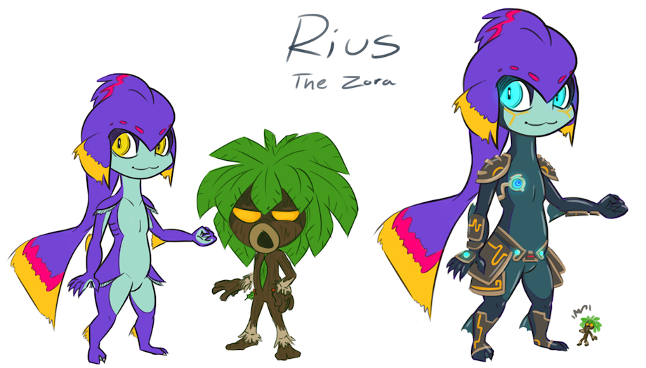 Rius goes on a treasure-hunting adventure dragging along Cycas the Deku (my own zelda OC) who can understand and read the language the Guardian technology employs; which is pretty handy when early on, a powerful and possibly dangerous suit latches on to the witless Zora. It seems to also be sentient, so Cycas must deal with both his overenthusiastic companion and the malfunctioning suit that only he can understand and TRY to fix.