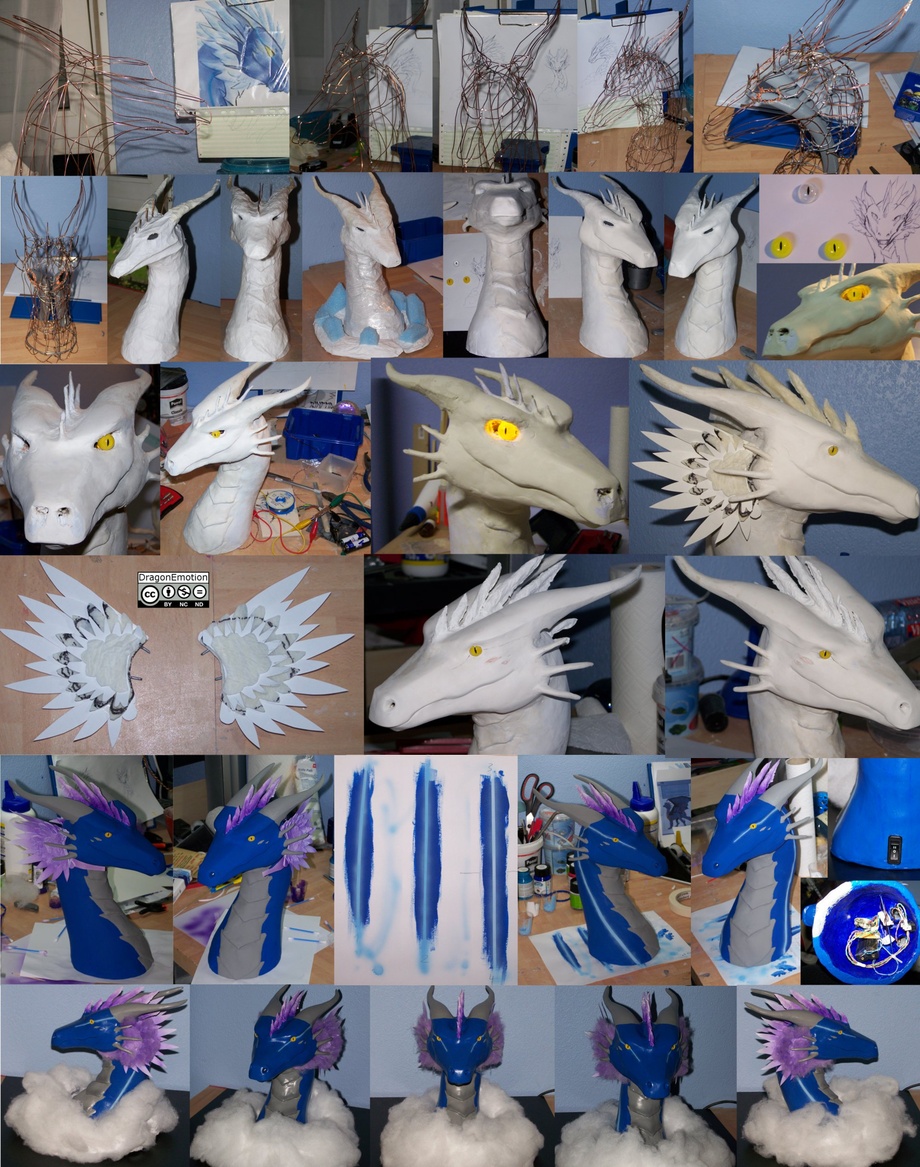 Leundra gave me some very good templates to work with. This is the result. I made this from May 2008 to August 2010. A long time, yes. I had to make a long break because of an accident in August 2008. (A broken clavicle was the result) Anyway, this dragon turned out well. The only thing I'm not satisfied with is the bump at the left eye that disturbs the glowing blue line and the symmetry. I used airbrush the first time with this piece. The electronics inside are made out of a modified electronic candle and some light emitting diodes. You can see the flickering in action here: