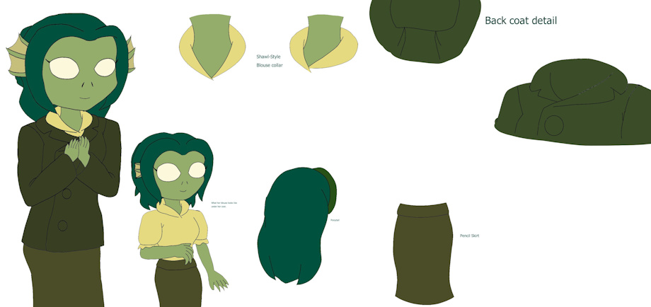 Wears a seemingly fancy outfit consisting of a greenish tweed coat, olive green skirt and a dirty-yellow shirt with a Shawl-Style collar.