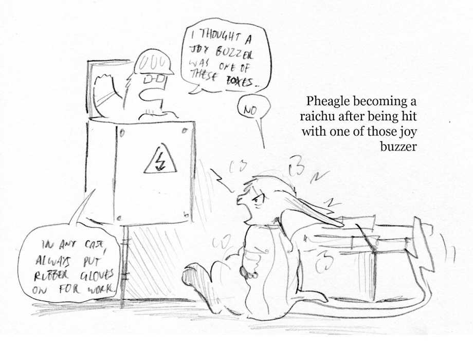 Cerv's not from the United States, so when I told him a joy buzzer was a harmless prank, he misunderstood, and instead using one of those large electric boxes to zap me. Naturally when i get shocked I become a Raichu and I was not pleased at Cerv for interrupting my work!