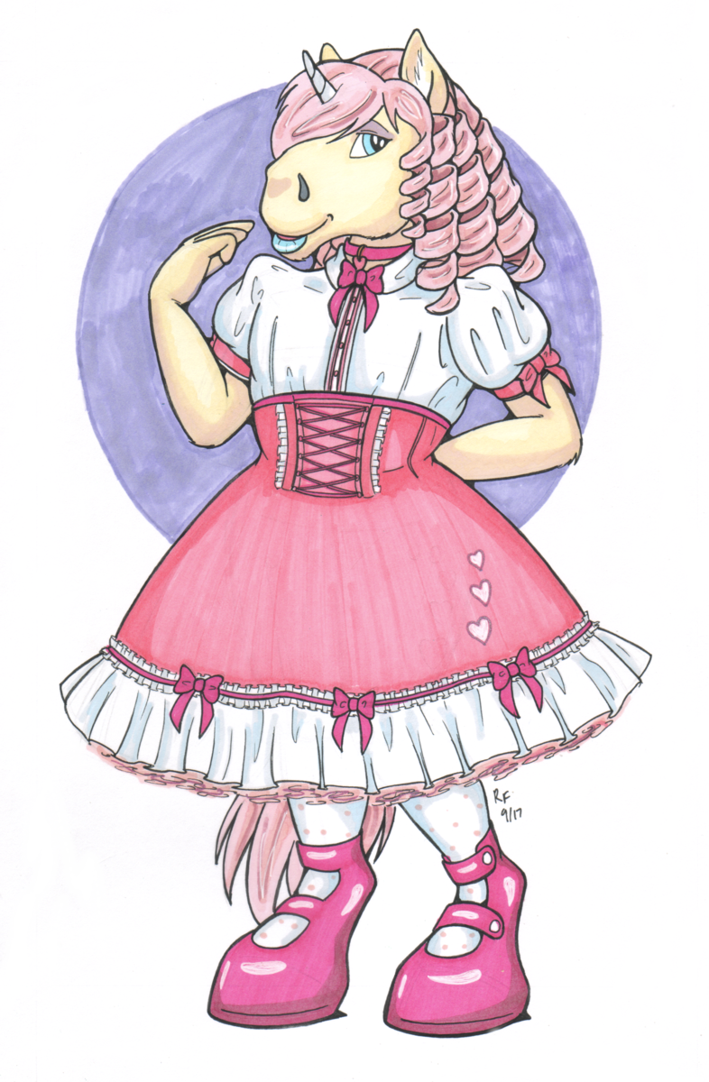 Almost done! Yuki takes out the curlers, and lets his lovely curled mane fall down around his shoulders. Next he puts on a cute blouse with poofy sleeves and pink bows, pink shoes that go over his hooves, and a high waist lolita skirt! Doesn't he look darling already?