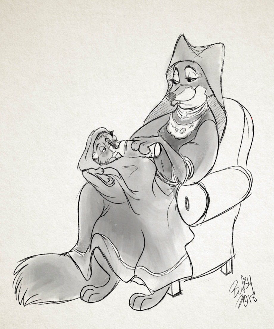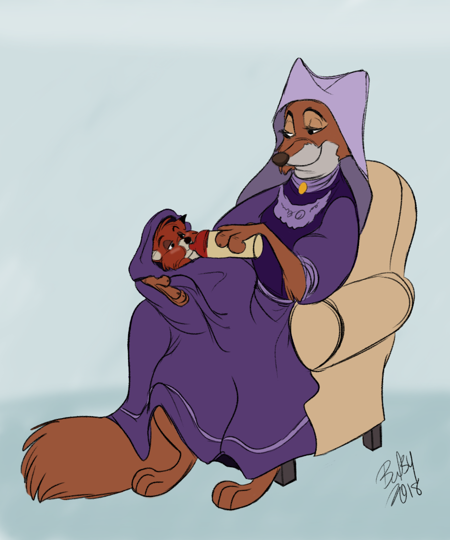 Maid Marian (from “Robin Hood”), who works as a nurse at the city hospital, is tasked by the orphanage/nursery ward to take care of a baby Tod (from “The Fox and the Hound”), who is touched with a small noncontagious fever. After failing to find a blanket to wrap him up in, Marian suddenly looks down at the poofy new skirt of her dress and decides that it would make a good substitute. And so it did! And of course, as pictured above, Tod is being fed a warm bottle of milk by his newfound foster mother, and bundled up safely in her ‘sick day blanket’, hence the title of this commission.